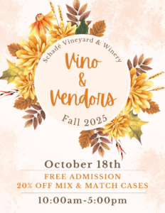 Fall 2025 Vino & Vendors Come shop the amazing vendors and enjoy a wine case sale. + Add to Google Calendar + iCal / Outlook export Date Oct 18 2025 Expired! Time 10:00 am - 5:00 pm Share this event